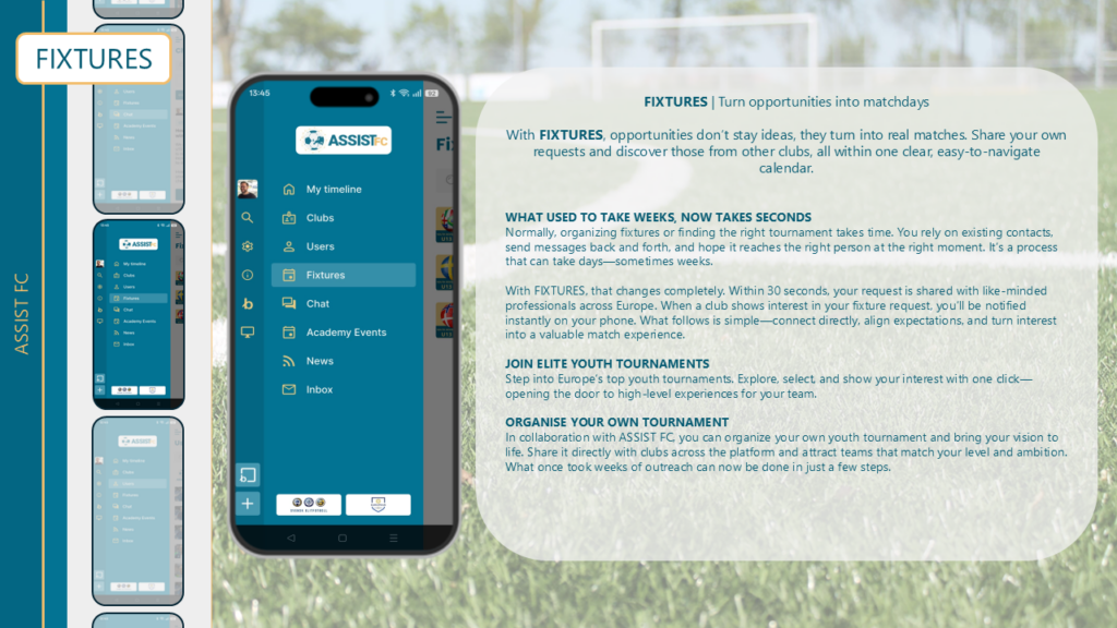 With FIXTURES, opportunities don’t stay ideas, they turn into real matches. Share your own requests and discover those from other clubs, all within one clear, easy-to-navigate calendar.